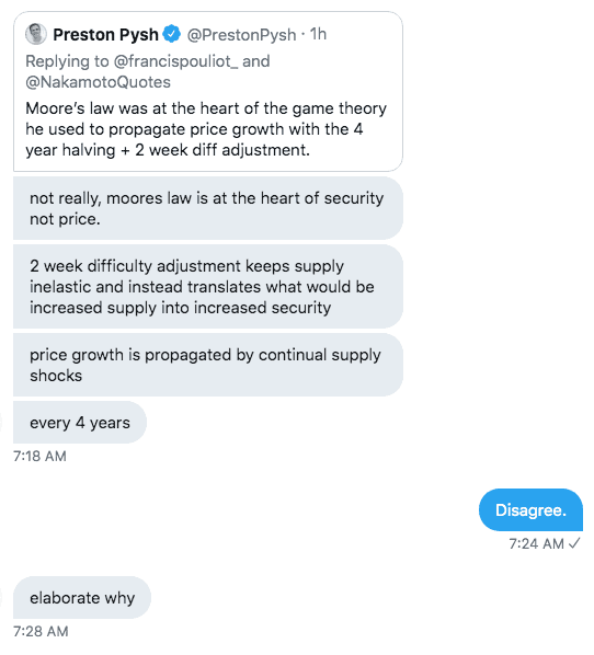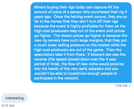 Below is a private conversation with a friend that addresses a common question on Moore’s Law being built into the Bitcoin incentive structure. I get a lot of questions about this, so I felt it was easier to share this conversation instead of re-creating it everywhere on Twitter. – Preston