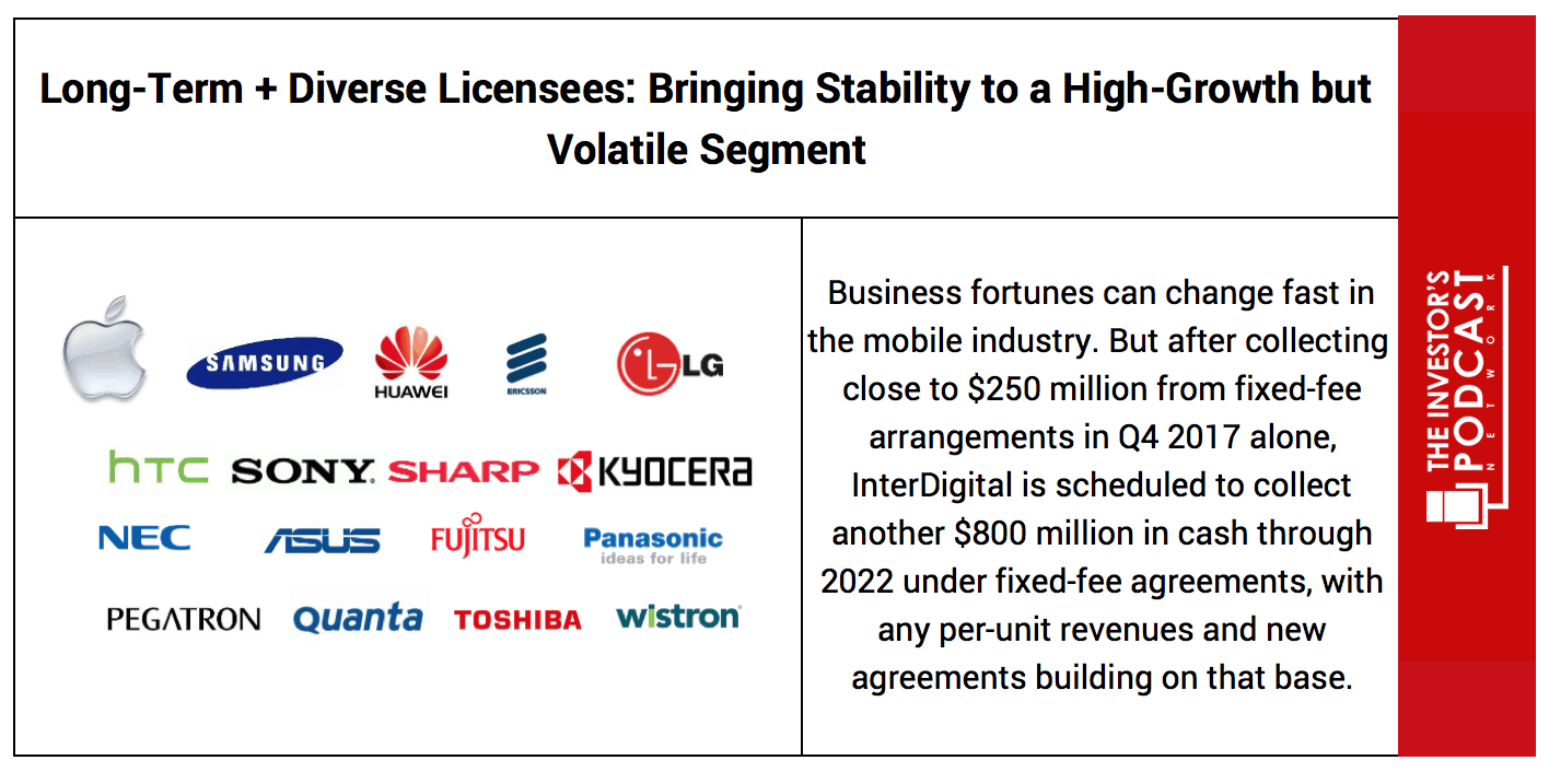 • While InterDigital Inc. has a broad client base of licensees, it still derives a significant proportion of its revenues and earnings from the top players in the industry. Apple, Huawei, Samsung, and Blackberry comprised approximately 21%, 14%, 13% and 13% of the firm’s total 2017 revenues respectively. A loss of one or more of these customers would likely impair the company’s future performance, but this is unlikely to occur in the near to mid-term since InterDigital Inc. is so embedded in the industry and currently has multi-year agreements in place with these clients.