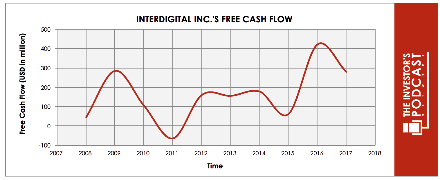 To determine the intrinsic value of InterDigital Inc., we’ll begin by looking at the company’s history of free cash flow. A company’s free cash flow is the true earnings which management can either reinvest for growth or distribute back to shareholders in the form of dividends and share buybacks. Below is a chart of InterDigital Inc.’s free cash flow for the past ten years.