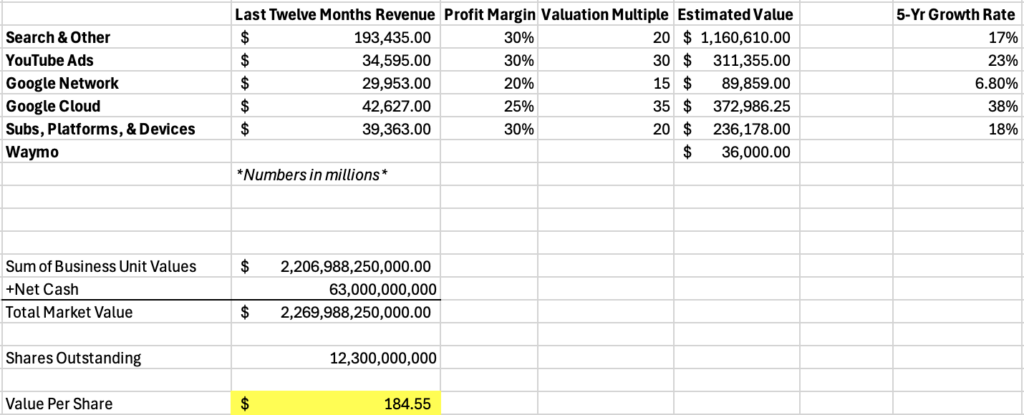 Waymo has been through venture capital rounds that value it at about $45 billion (~$36 billion reflecting Alphabet’s stake), so we have a decent estimate of Waymo, but again, not for some of those other businesses. Rather than zero in on them too much, I’d prefer to account for those values by being slightly more aggressive elsewhere in my valuations of Alphabet’s core businesses.